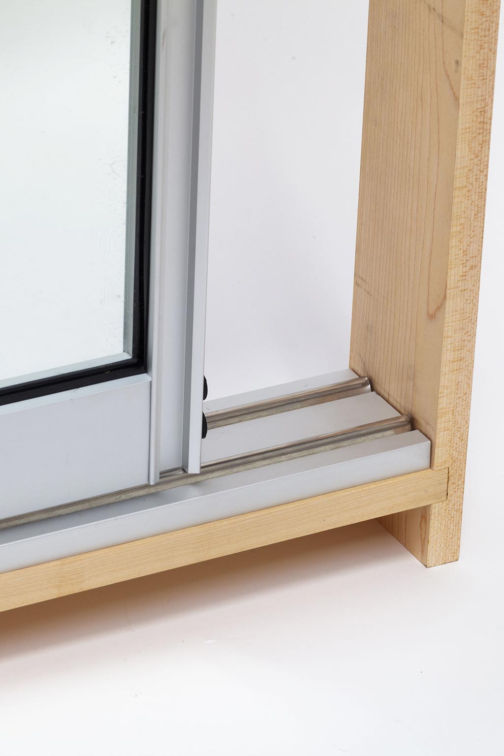 Triple-track configurations available. Heavy-duty aluminum top and bottom sills with snap-in stainless steel tracks.