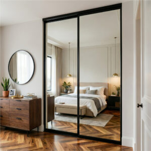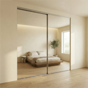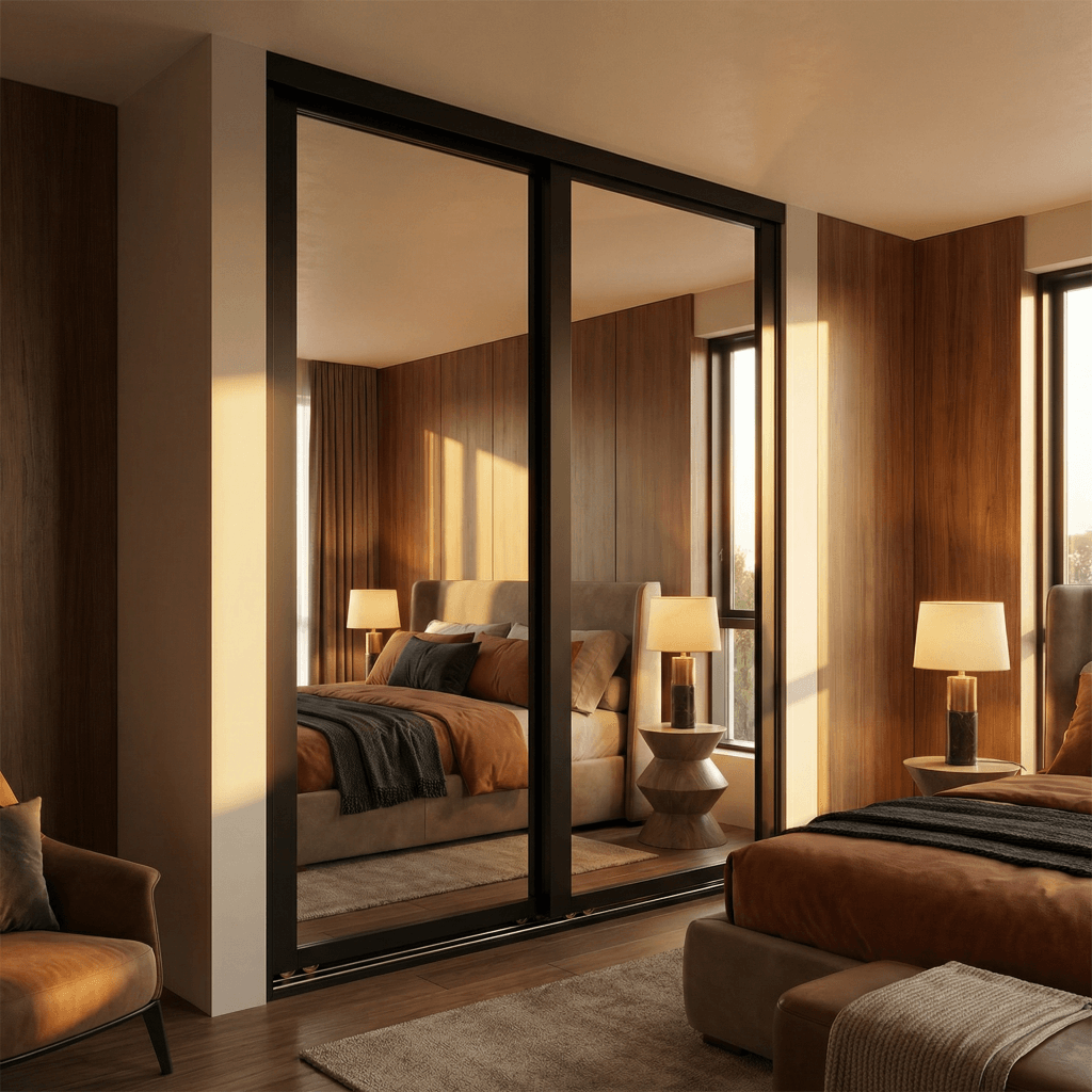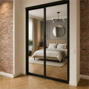 McCoy Doors & More specializes in premium sliding mirror door systems featuring professional-grade construction: thicker-walled aluminum extrusions, commercial stainless steel tracks, tandem steel rollers, and 3/16″ safety-backed mirrors. Backed by a 5-year warranty.