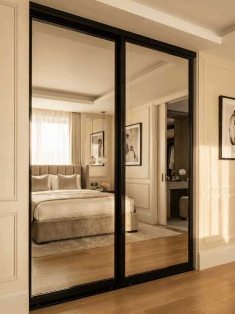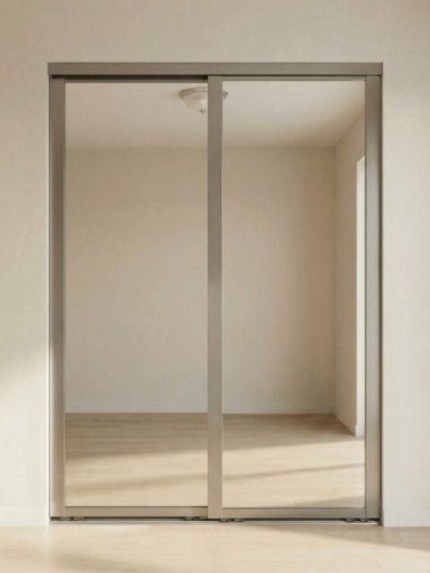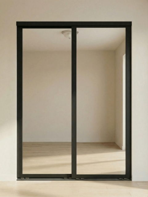 The wide style “Patriot” frame features a sleek, 3″ wide aluminum profile with a hollow tube side mold design. Built with heavy-duty extrusions, robust 3/16″ mirrors, and smooth-gliding tandem steel wheels, this model combines durability with clean, modern aesthetics.